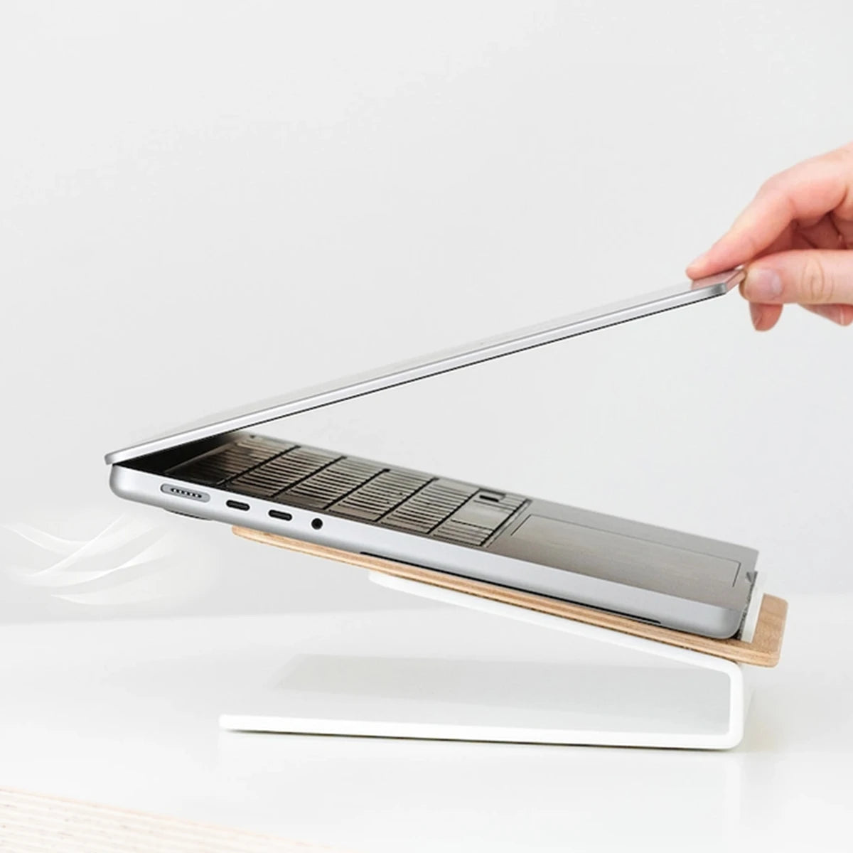 The non-slip base made of natural cork keeps the stand firmly in place on your desk. A soft felt pad on the front also reliably protects your MacBook or laptop from scratches.