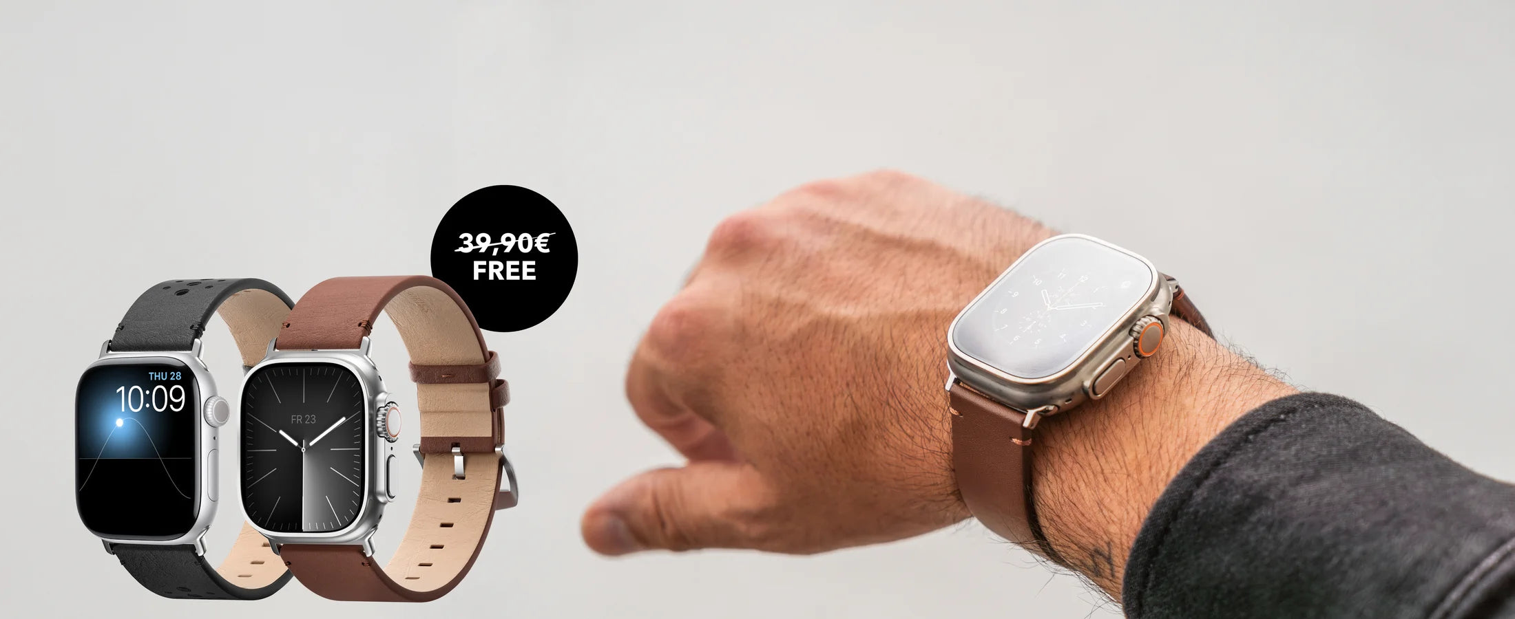 Exclusive deal for you! We're celebrating the release of our new Apple Watch bands and are giving you two bands for the price of one for the first 24 hours. So you save a whole €39.90! How does it work? Simply sign up and receive your code by email on the day of release!