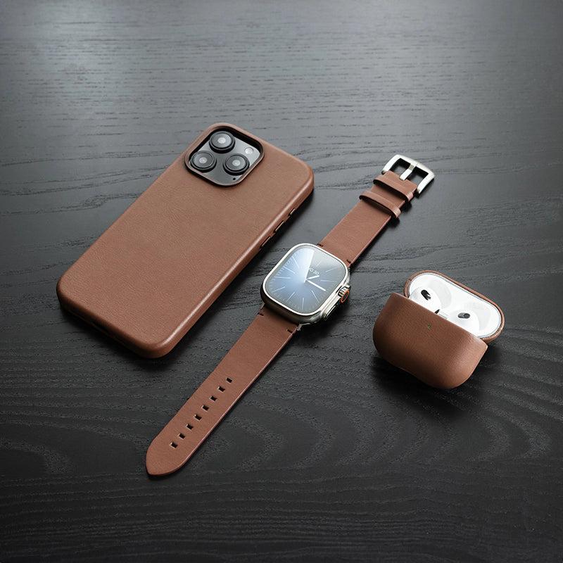 Combine our premium watch band with our top selling, innovative iPhone and AirPods leather cases for a matching, classy look! Choose between midnight black and rusty brown!