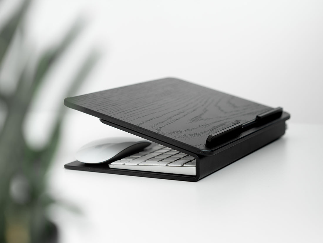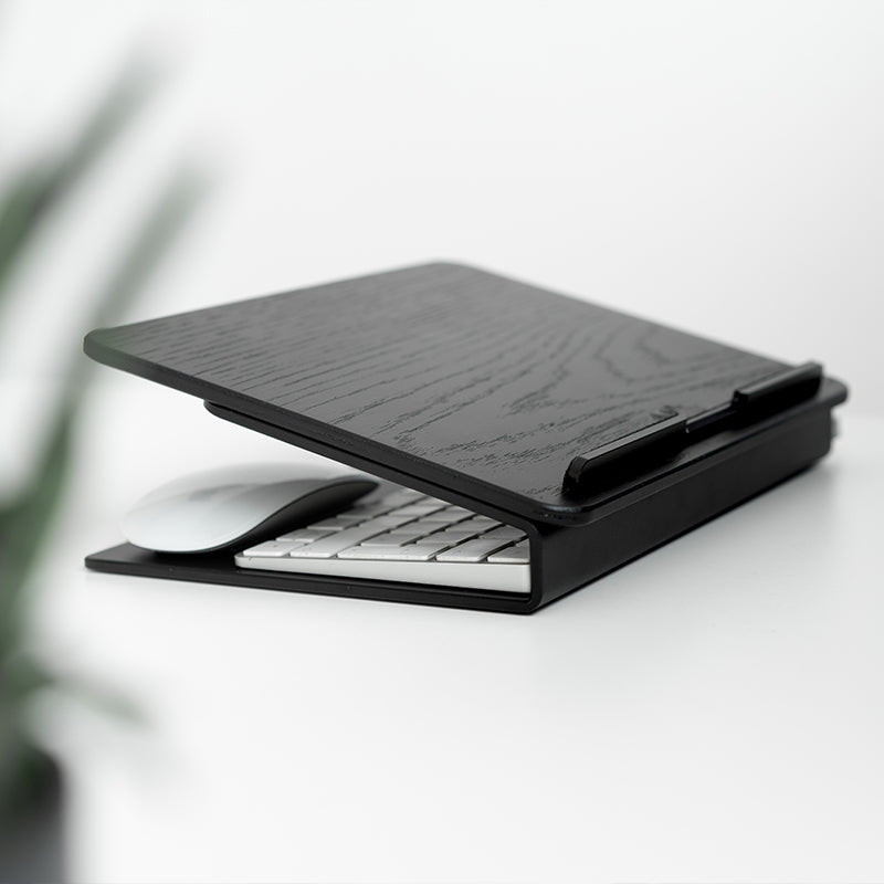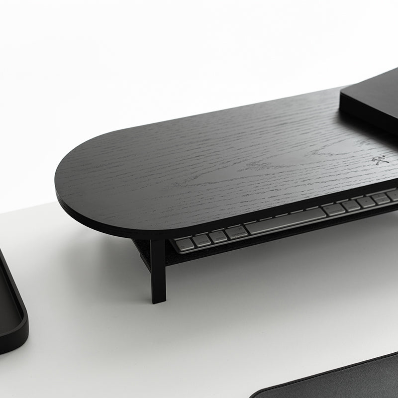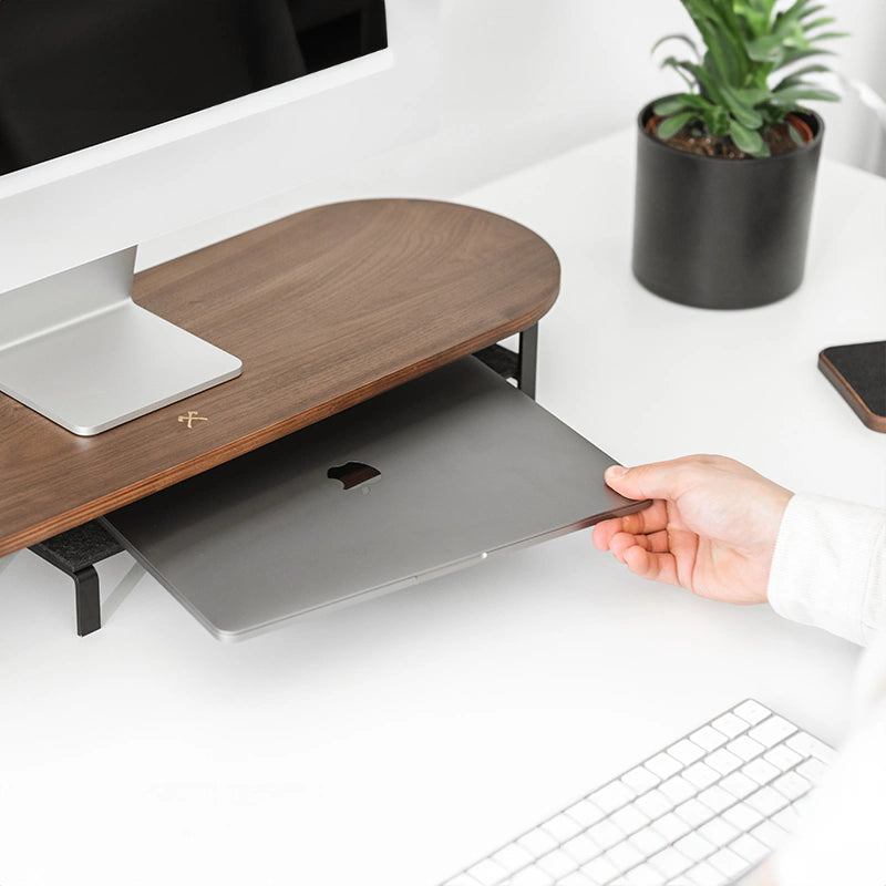 Select walnut and oak wood combined with a matte recycled aluminum base give the monitor stand a sustainable design.