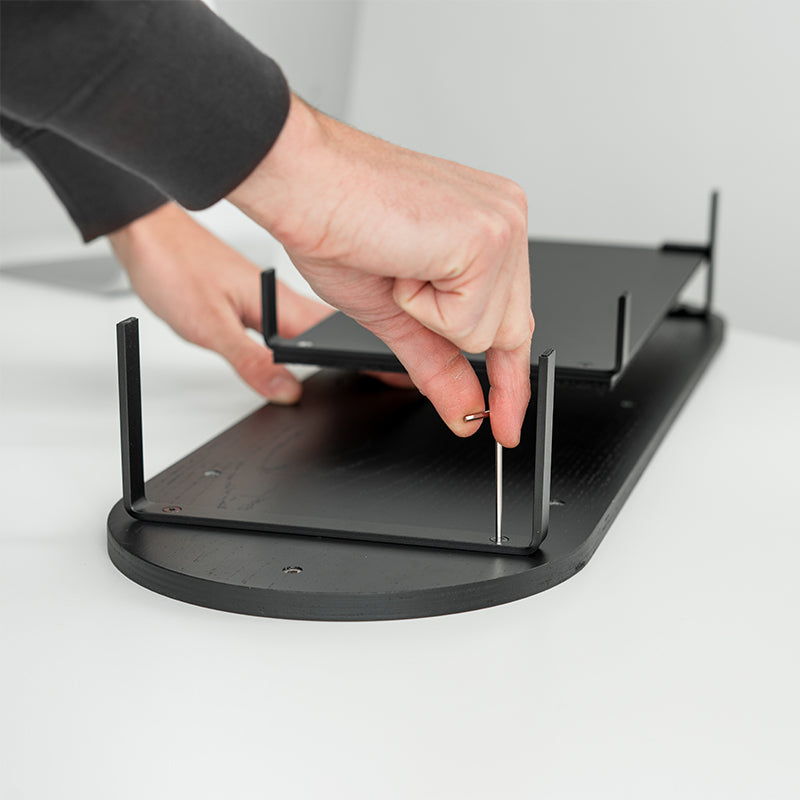 Just like the aluminum legs, the shelf is screwed on with the enclosed Allen key. One of the two legs has a small protrusion with a screw hole in the front and back at mid-height, to which you attach one side of the shelf. The other side is supported by the third smaller leg. You will find an explanatory illustration in your supplied instructions.