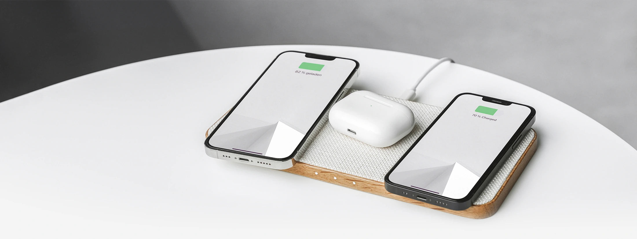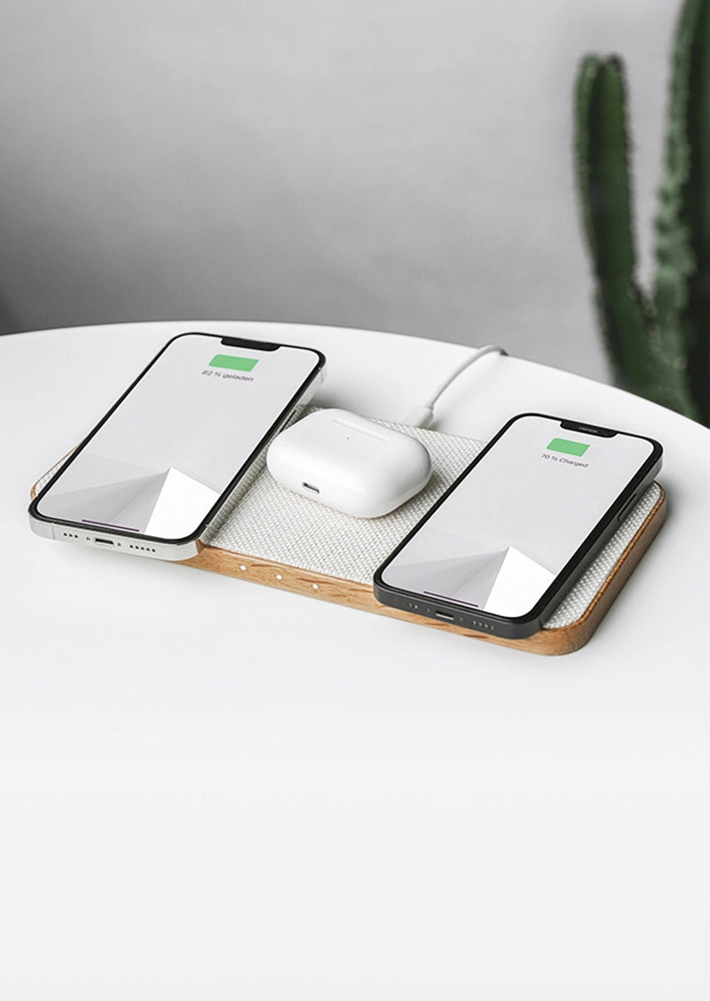 Minimalist and elegant charging with our 30W premium wood & fabric charging station! With the 3 charging zones you can charge smartphones and AirPods at the same time with up to 15W fast charging! With the discreet LED lights you always have an overview of the charging process!