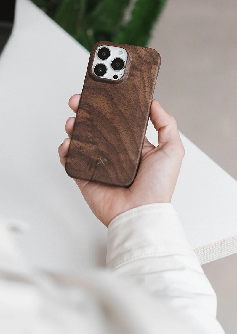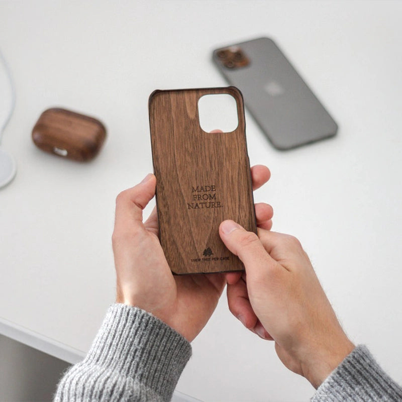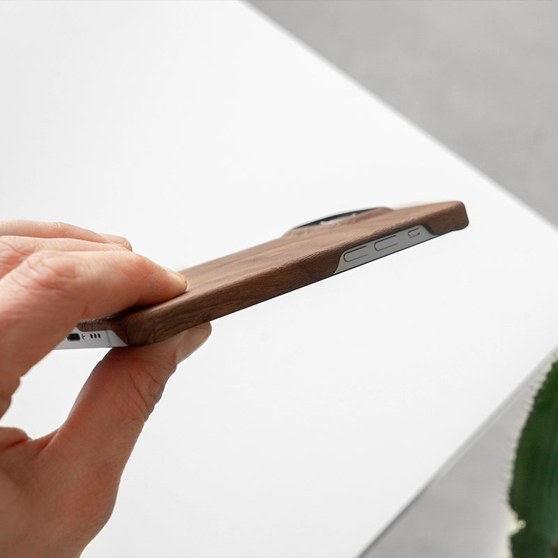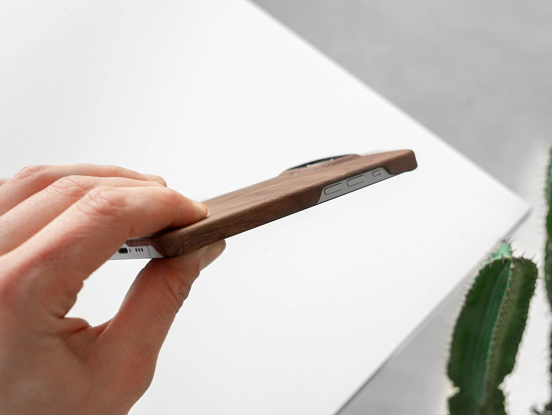 Thanks to the ultra-thin wood layer, using the Apple MagSafe© Charger is no problem at all. This keeps the full magnetic force between your iPhone and your wireless charger and provides the necessary hold. The leather wallet from Apple also has a certain hold. However, we would like to point out that the MagSafe Leather Wallet does not have the strongest magnetic pull and can therefore slip on the smooth surface of our Slim Case. But we are already working on our own solution!