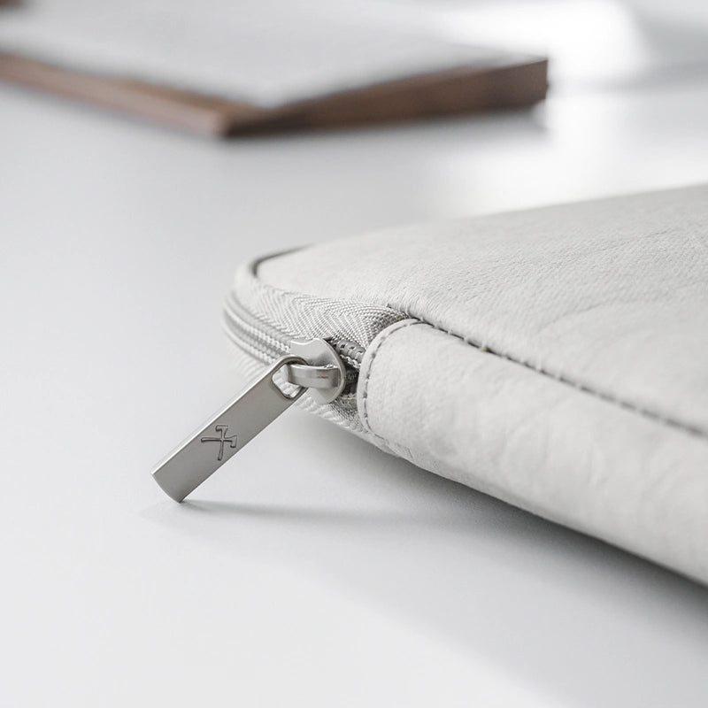 Our MacBook Sleeve is made from German Texon Vogue® kraft paper, which is 100% natural wood pulp. This sustainable material is both FSC® and OEKO-TEX® certified, which means we can guarantee both environmental friendliness and freedom from harmful substances. It is also very durable, water resistant and can withstand prolonged outdoor use. The high quality leather look and feel makes it the perfect green alternative.