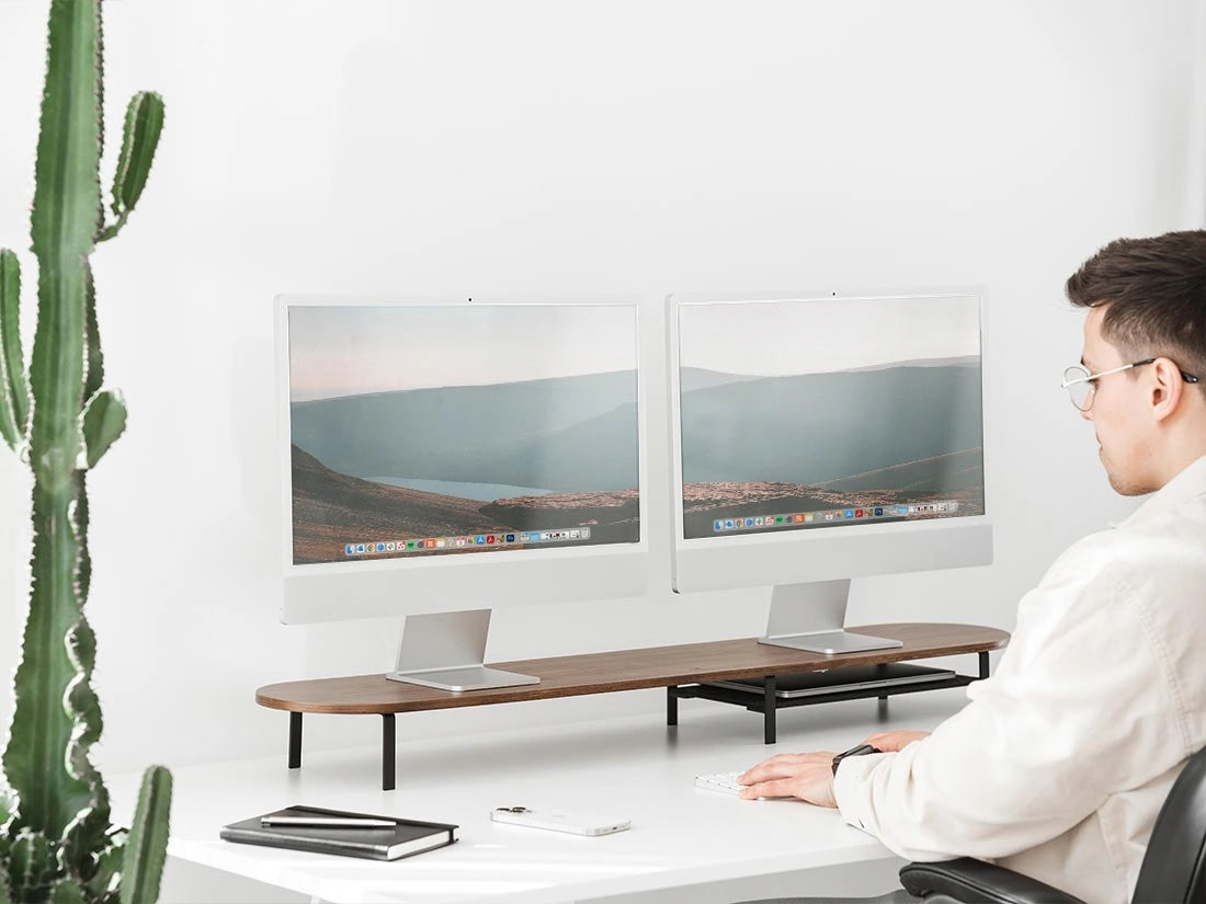 Select walnut and oak wood combined with a matte recycled aluminum base give the monitor stand a sustainable design.